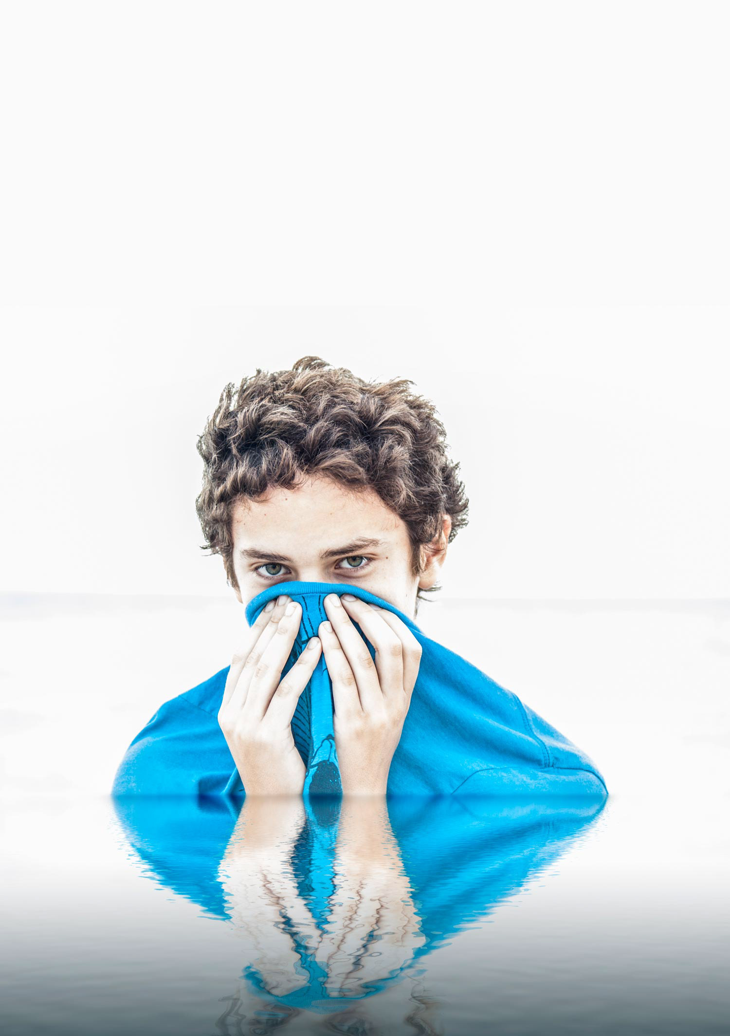 Model photographed, and retouched in Photoshop to create a water reflection effect.